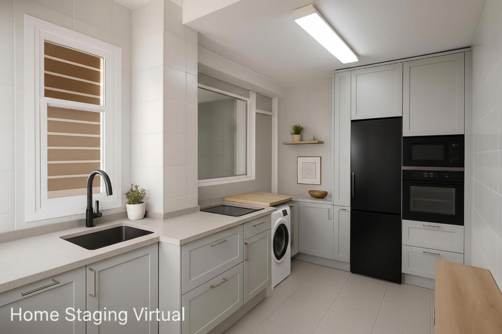 La vivienda se distribuye en un amplio salón con salida a terraza y zona de comedor independiente, con acceso directo a la cocina. Esta se divide en dos ambientes: zona de office y zona de trabajo, ambas con luz natural al tratarse de la planta superior. La cocina cuenta con doble acceso, desde el comedor y desde el recibidor, y conserva la puerta de servicio.